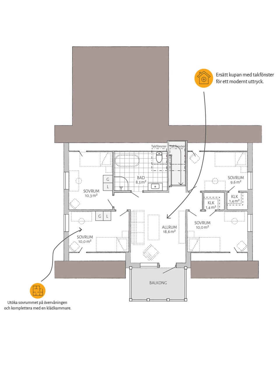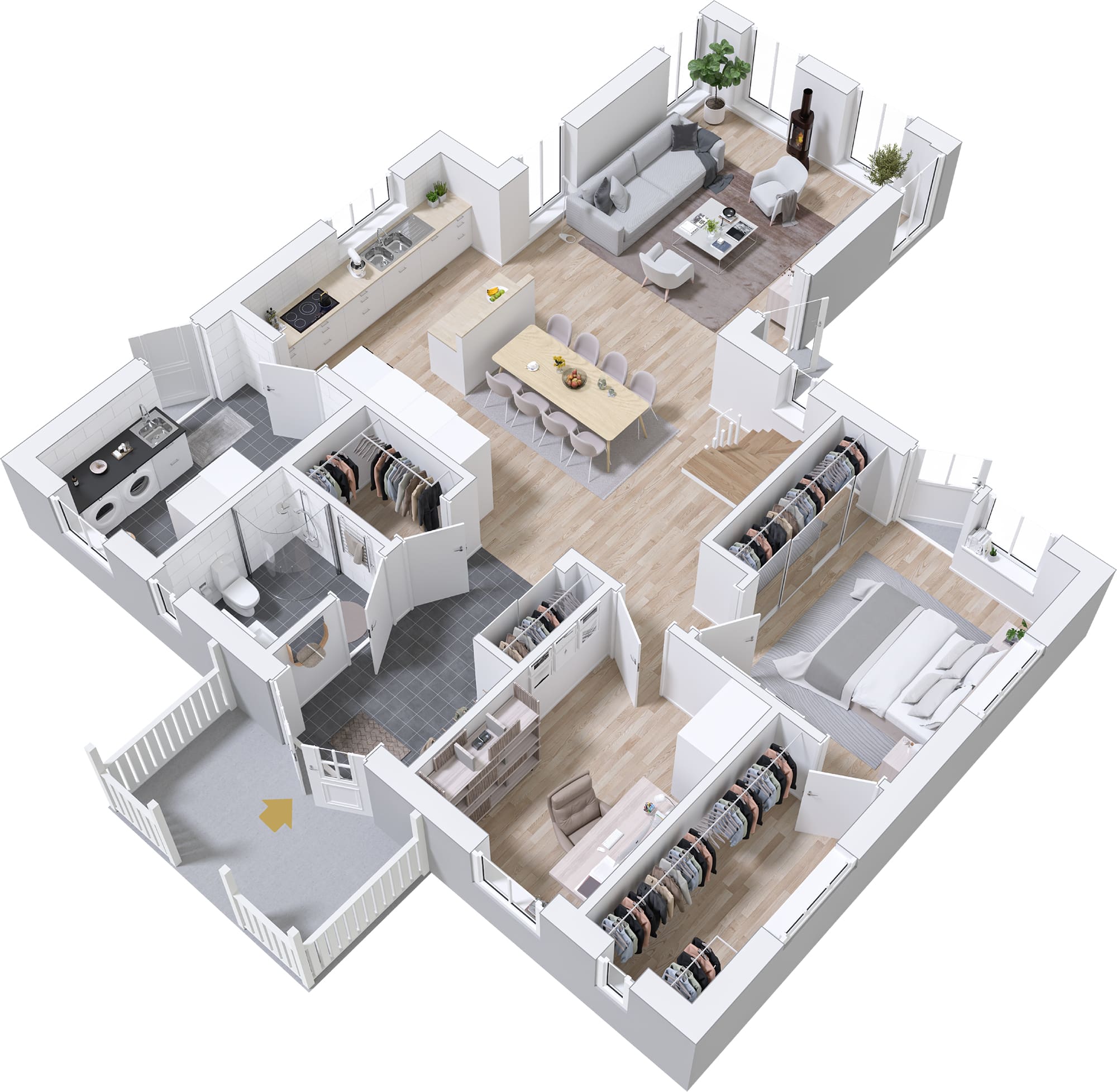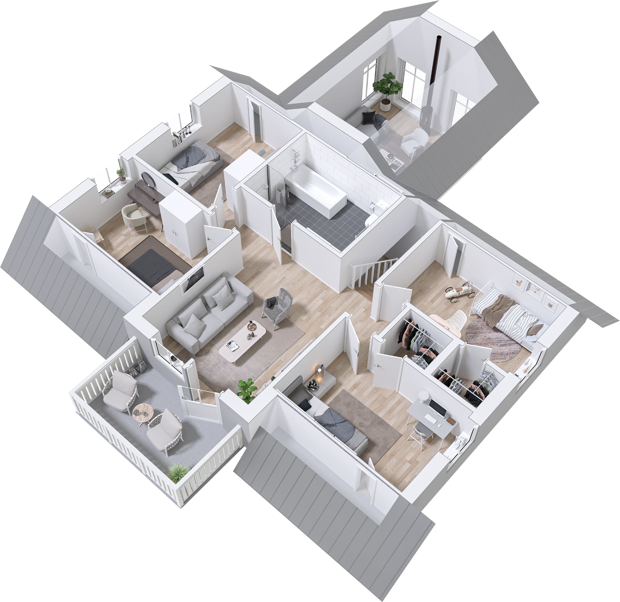 Med Björkhem kommer store muligheter. Skap en luksuriøs følelse ved å utvide et av soverommene med en separat garderobe. Kompletter med et ekstra lager under trappen for bedre oppbevaring. Vil du gjøre mer selv? Velg levering med uinnredet loft.