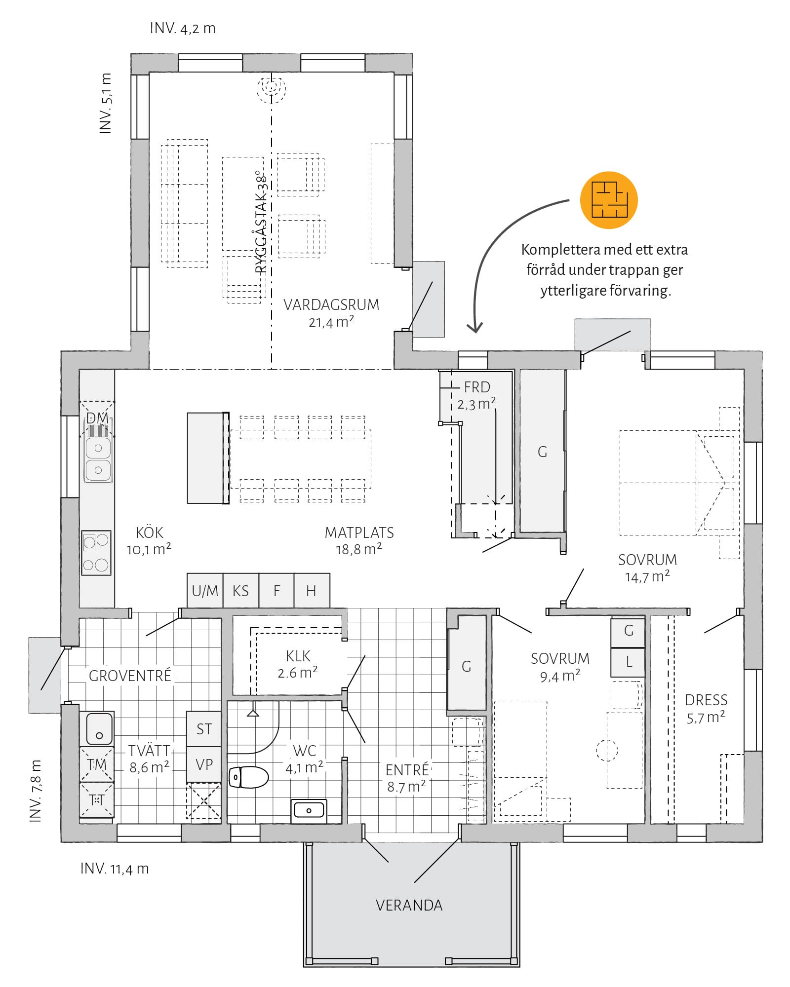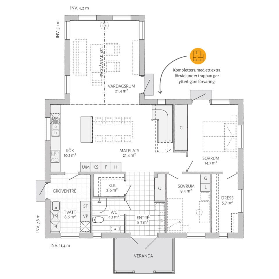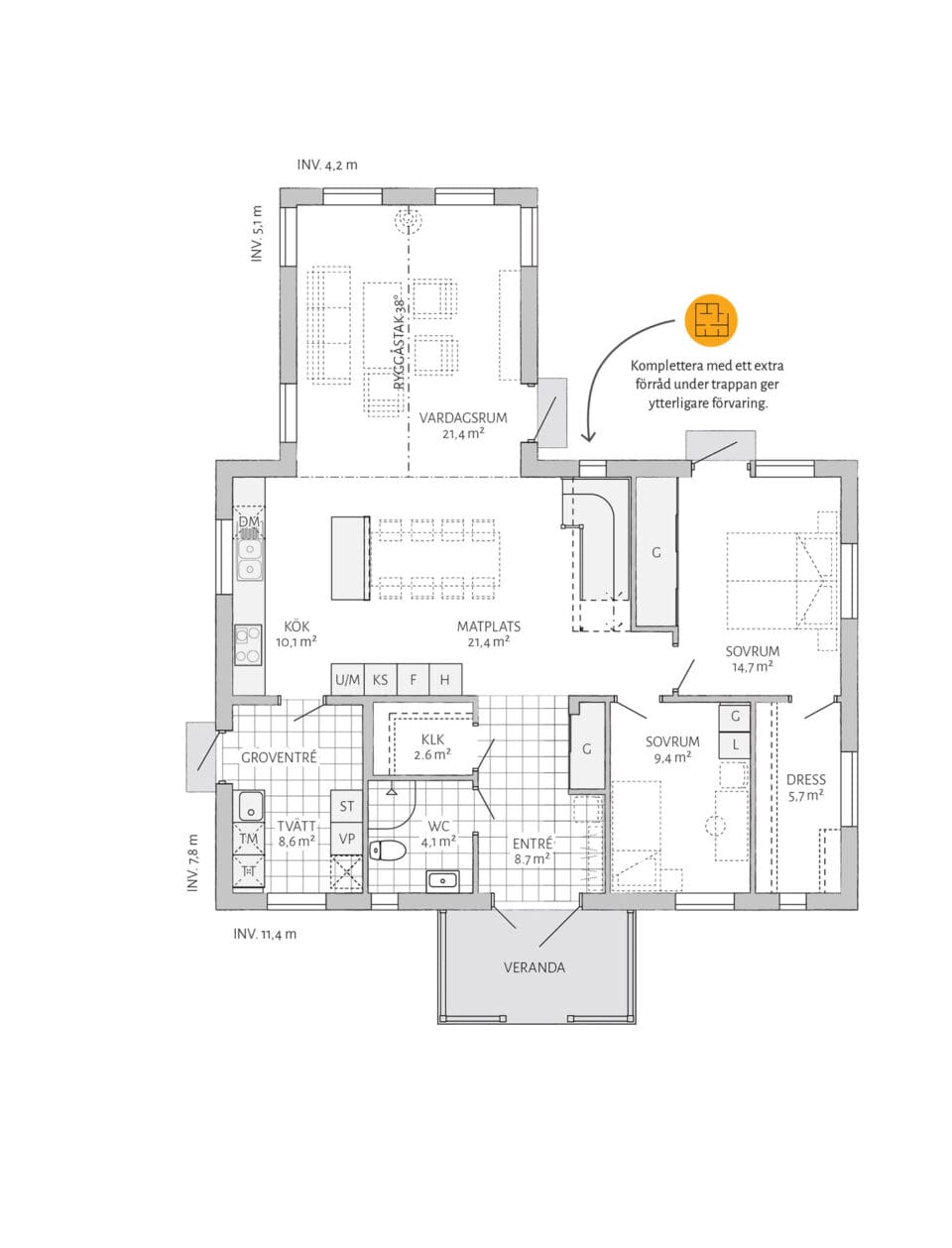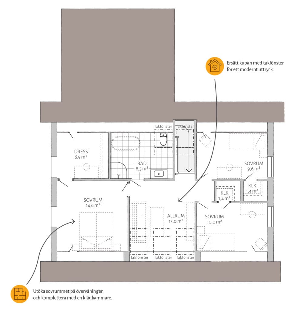 Med Björkhem kommer store muligheter. Skap en luksuriøs følelse ved å utvide et av soverommene med en separat garderobe. Kompletter med et ekstra lager under trappen for bedre oppbevaring. Vil du gjøre mer selv? Velg levering med uinnredet loft.