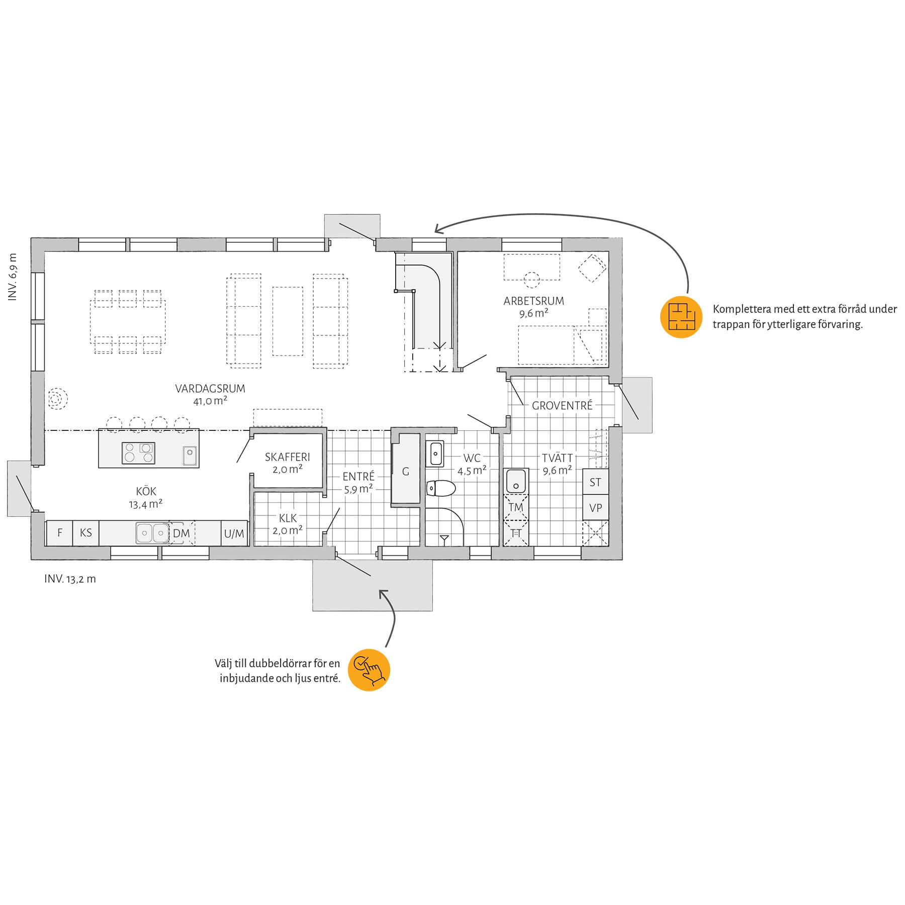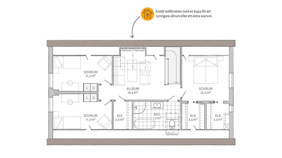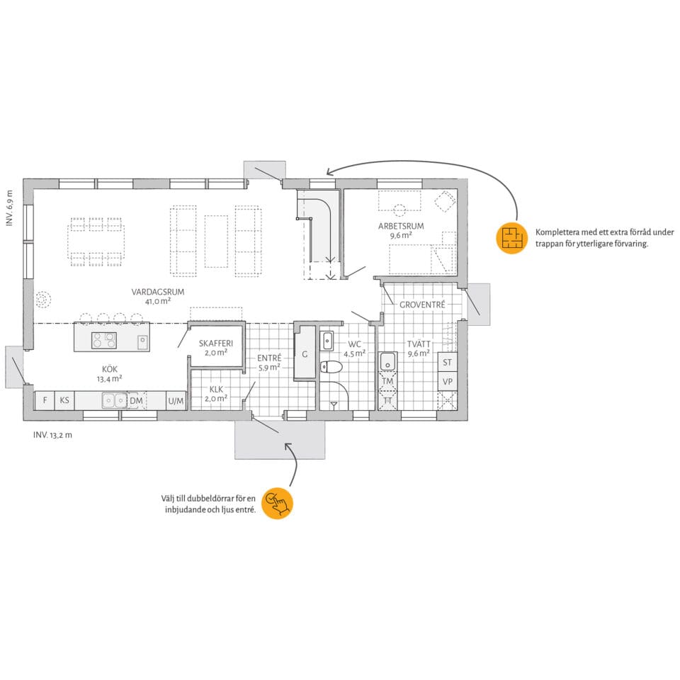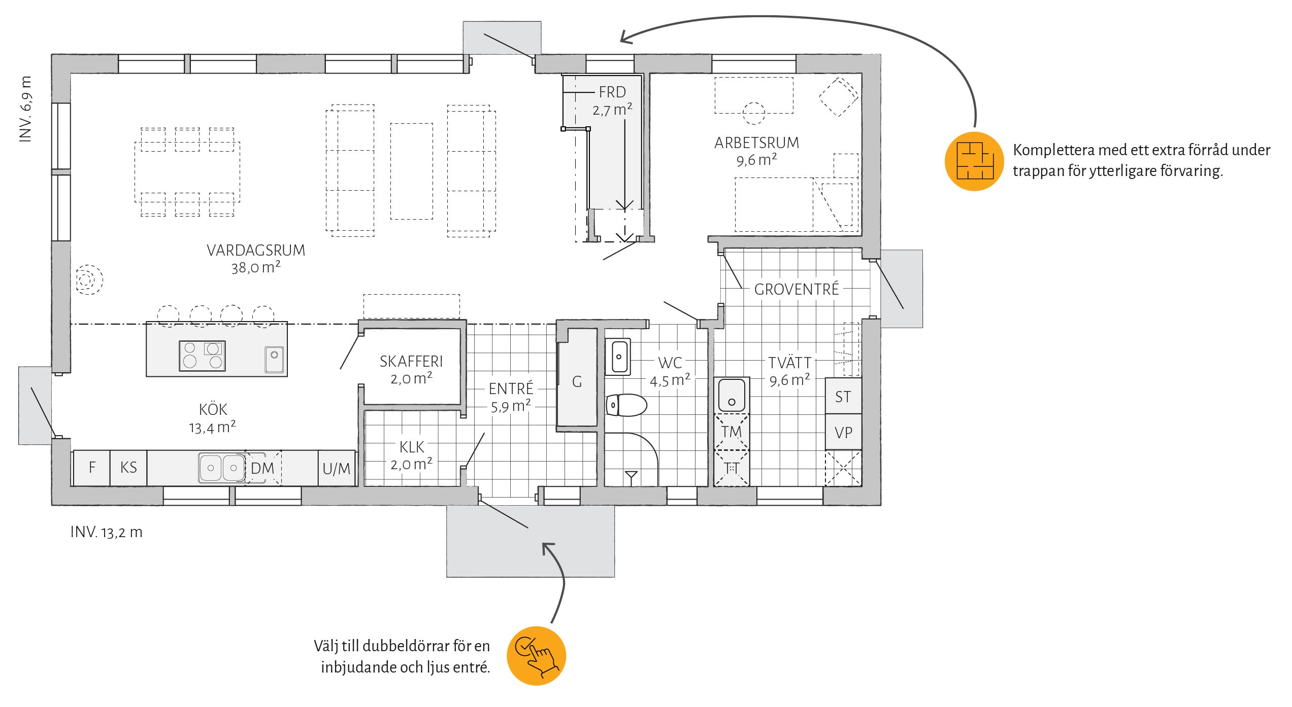I Dalhem er mye standard. Doble dører er et tilvalg som gjør inngangen stor og innbydende. Kompletter med takopplett for et større oppholdsrom og generøsere lysinnslipp. Et lager under trappen gir ytterligere oppbevaringsplass. Vil du gjøre mer selv? Velg levering med uinnredet loft.