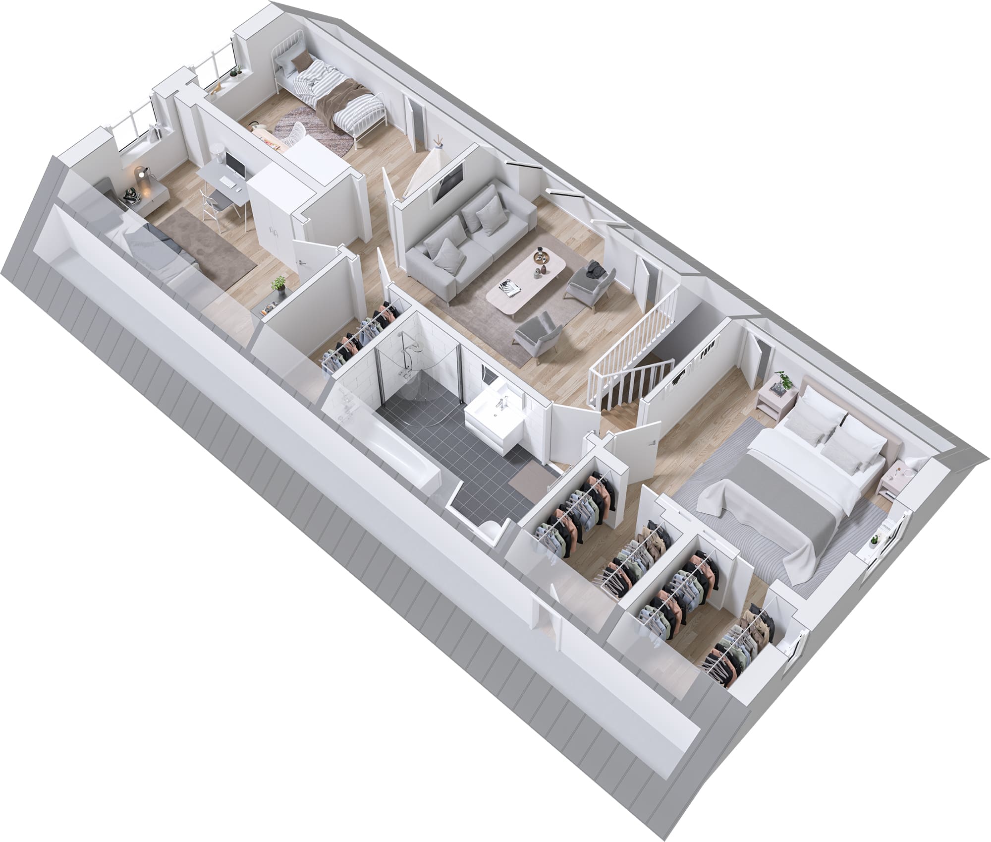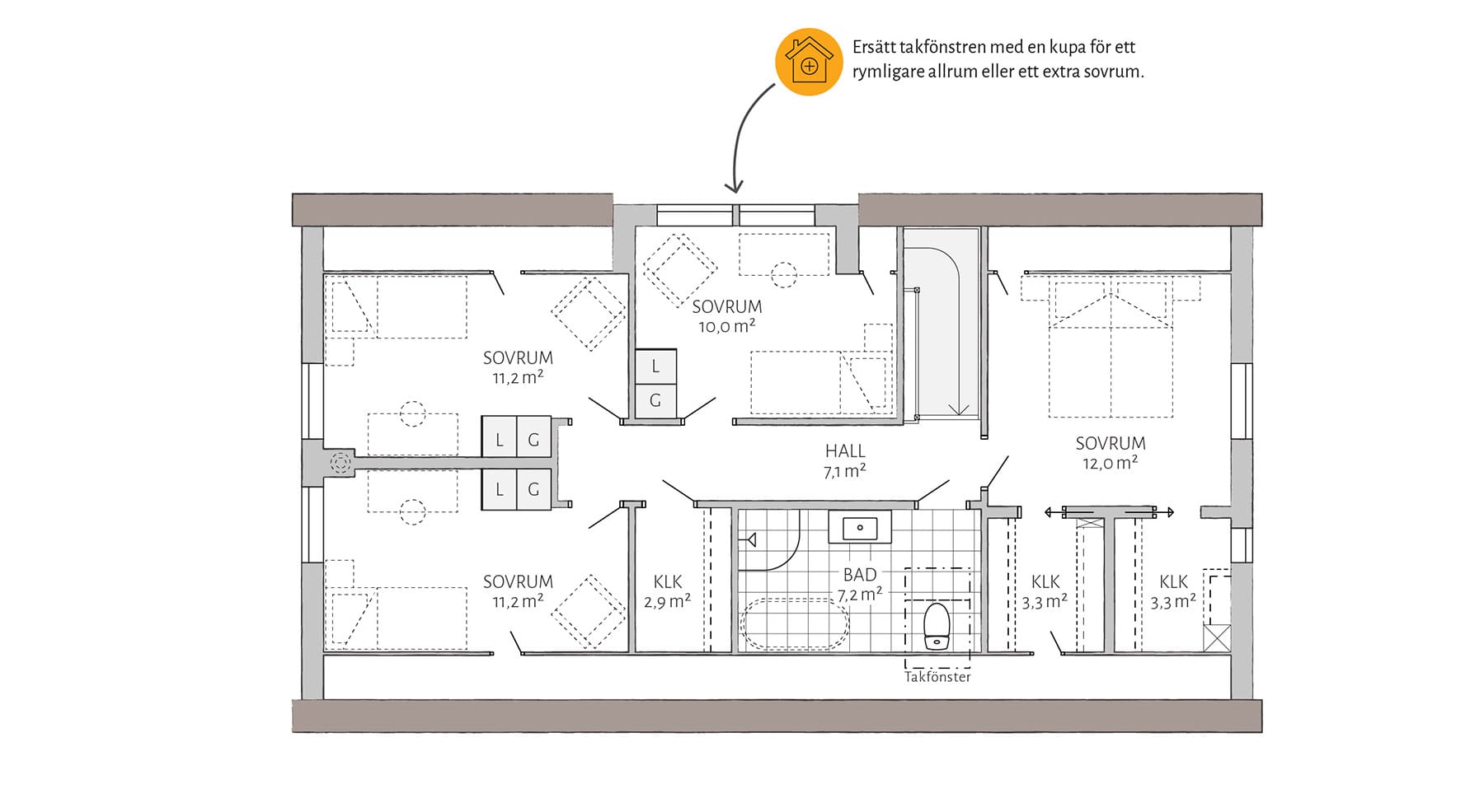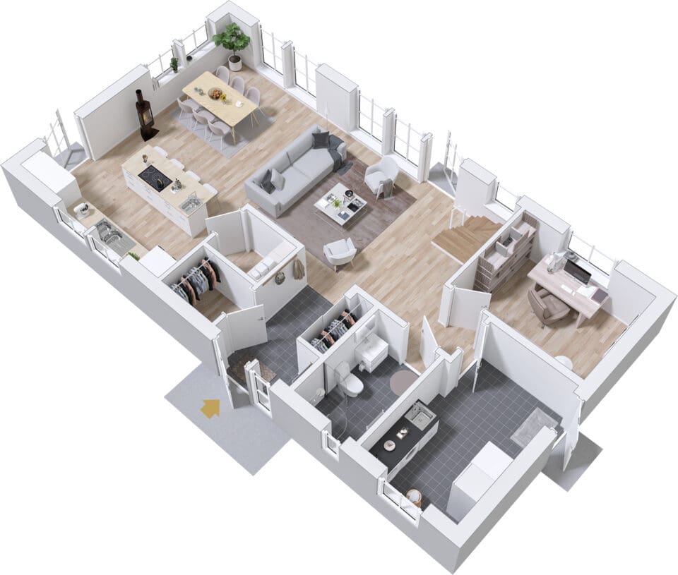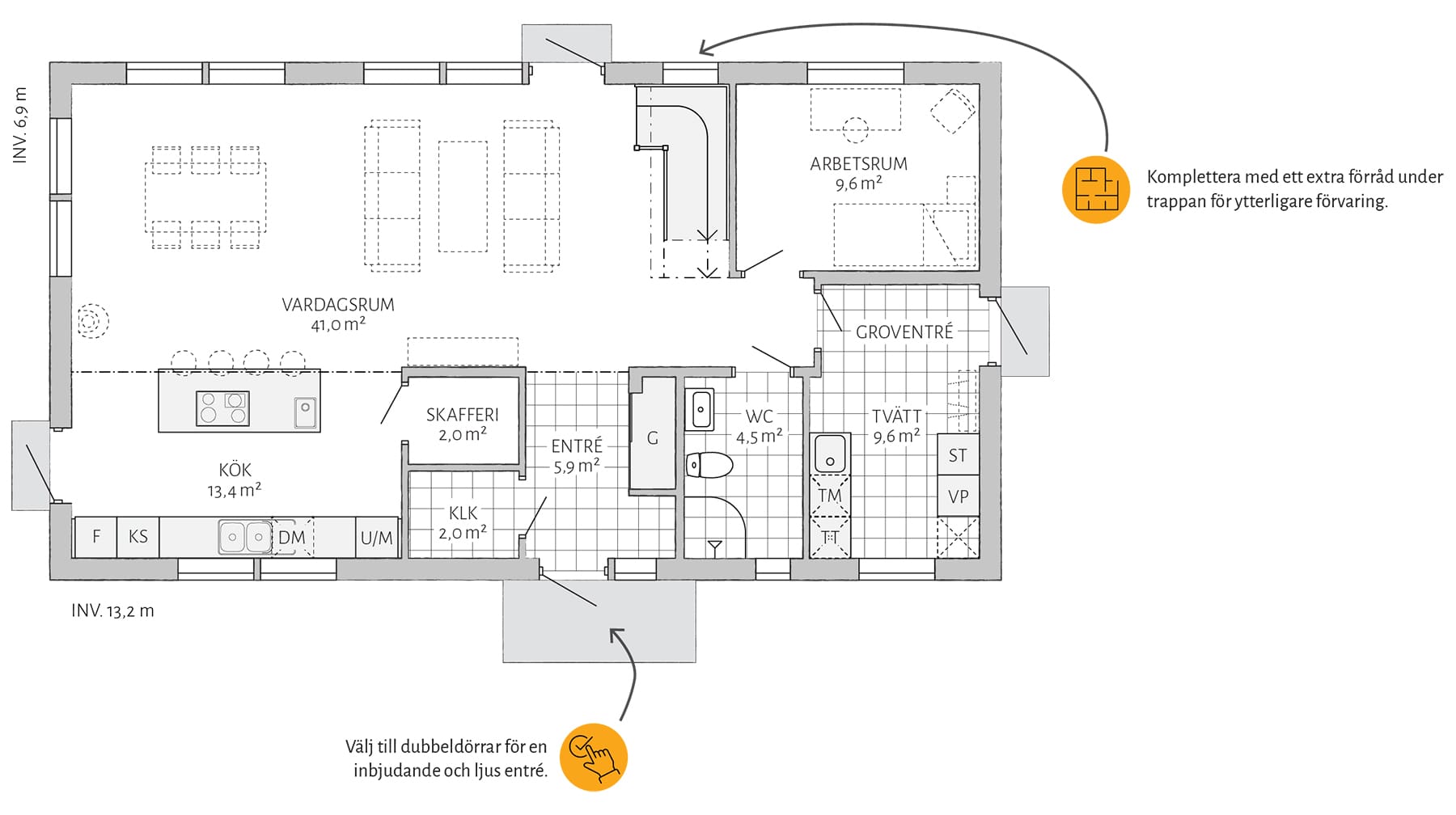I Dalhem er mye standard. Doble dører er et tilvalg som gjør inngangen stor og innbydende. Kompletter med takopplett for et større oppholdsrom og generøsere lysinnslipp. Et lager under trappen gir ytterligere oppbevaringsplass. Vil du gjøre mer selv? Velg levering med uinnredet loft.