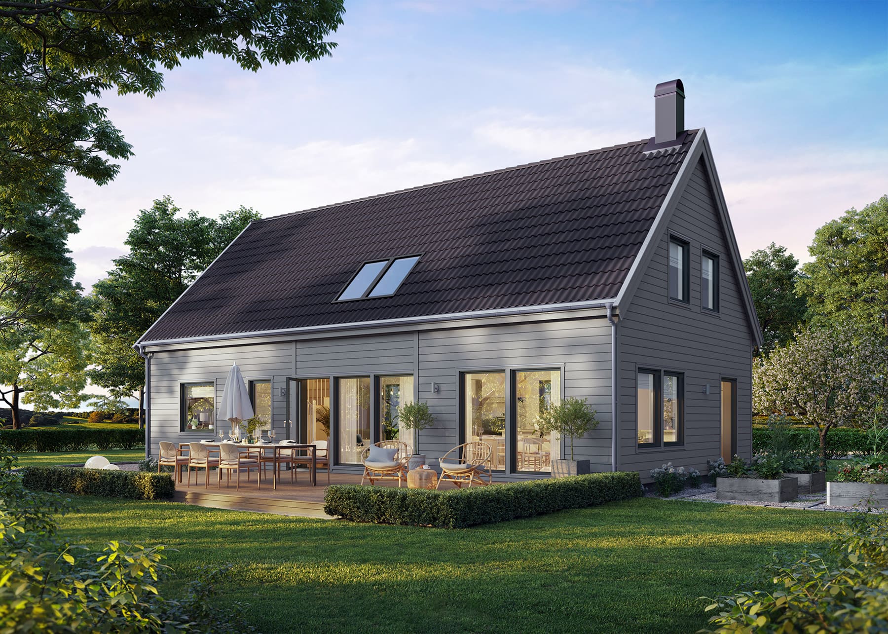 I Dalhem Modern kombineres åpne områder med rikelig med oppbevaring i en moderne tolkning av et klassisk låvehus. Resultatet er et hjem hvis moderne ytre og praktiske indre passer like godt i bymiljø som på landet. Husets hjerte, den romslige kjøkken-, stue- og spisestuedelen, har et stort spiskammer som standard, noe som gjør huset til en drøm for deg som elsker matlaging og gjerne inviterer både familie og venner!