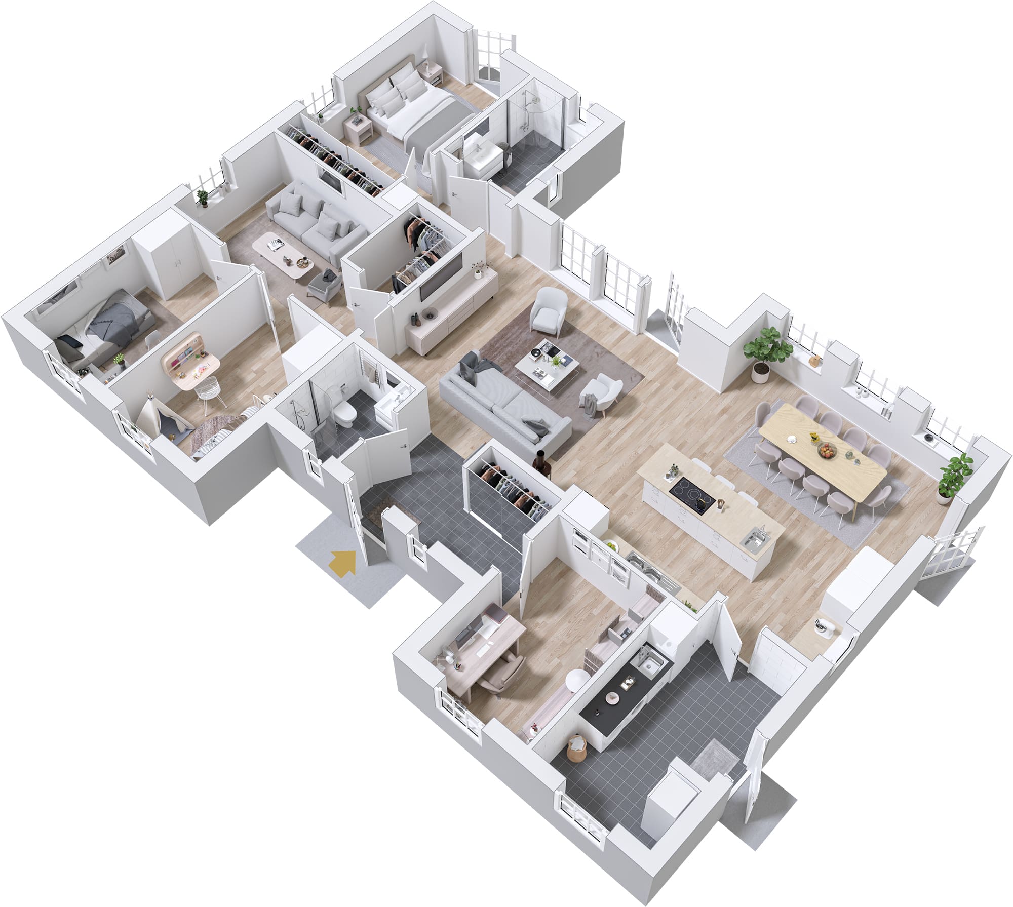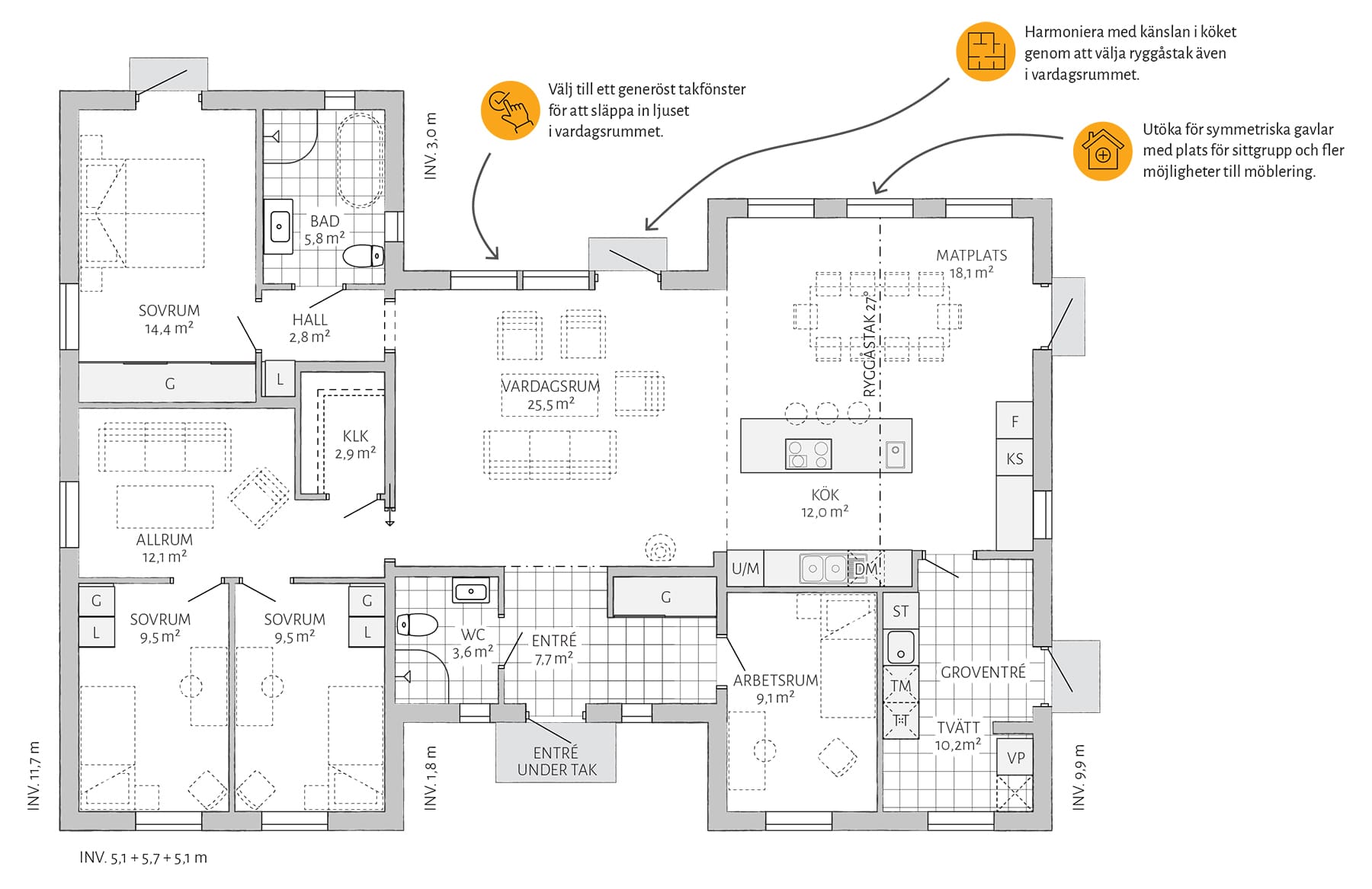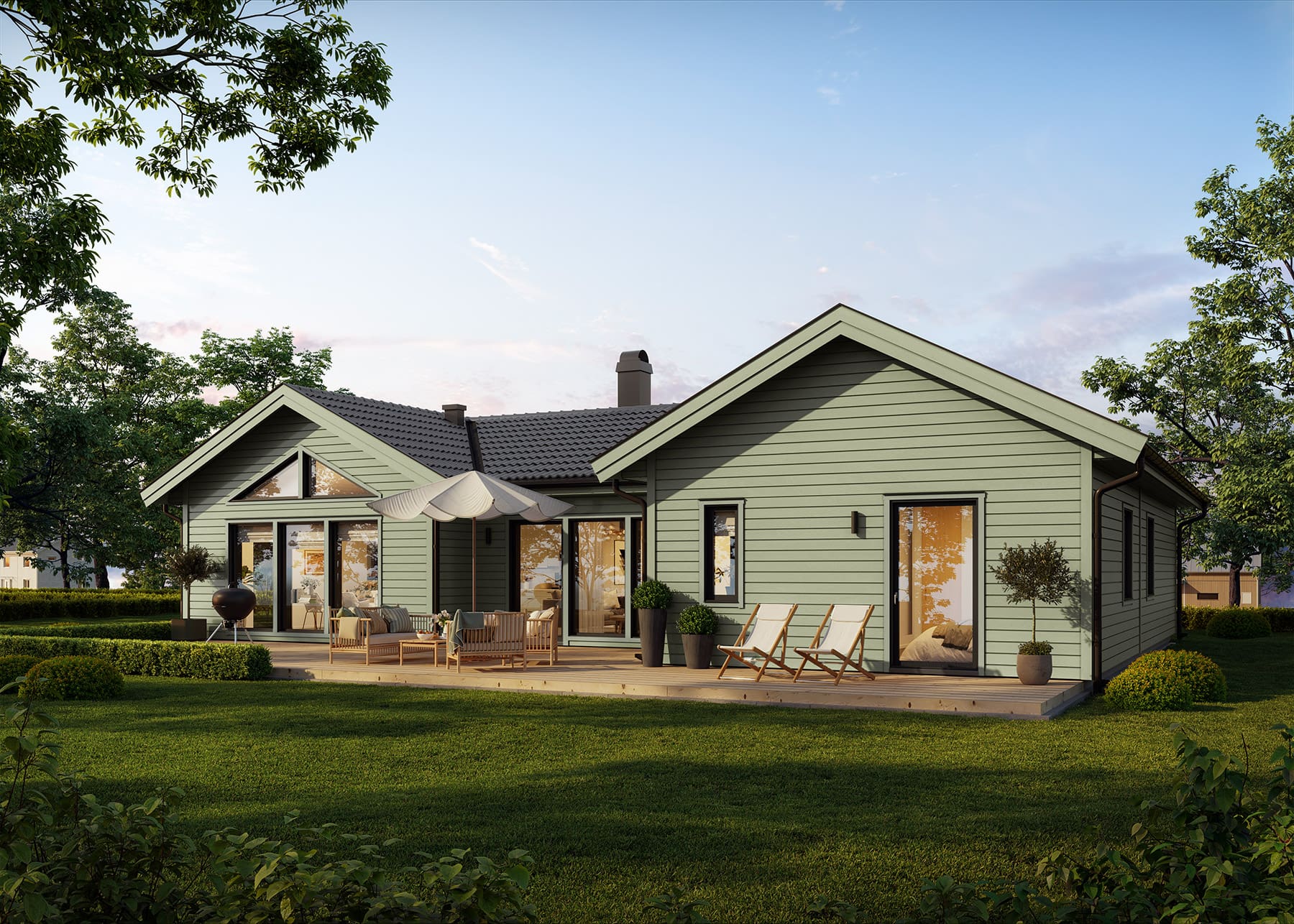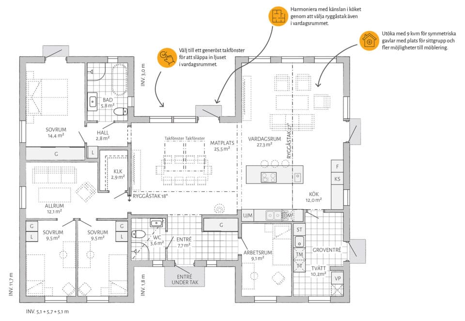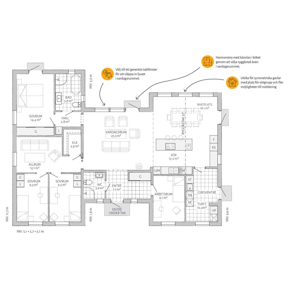 Hvordan vil du tilpasse ditt Sjöhem? Kanskje vil du skape en enda større følelse av rom ved å velge til mønetak i stuen? Eller lager du en ekstra utgang til hagen ved å velge en vindusdør i allrommet? Med Sjöhem finnes alle muligheter!