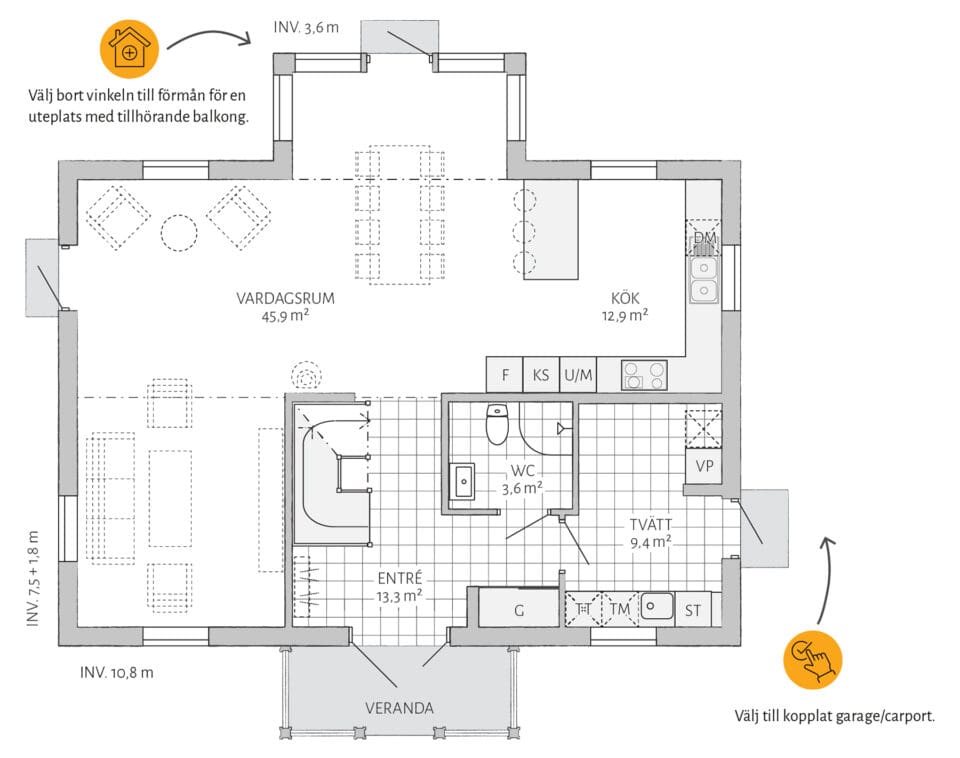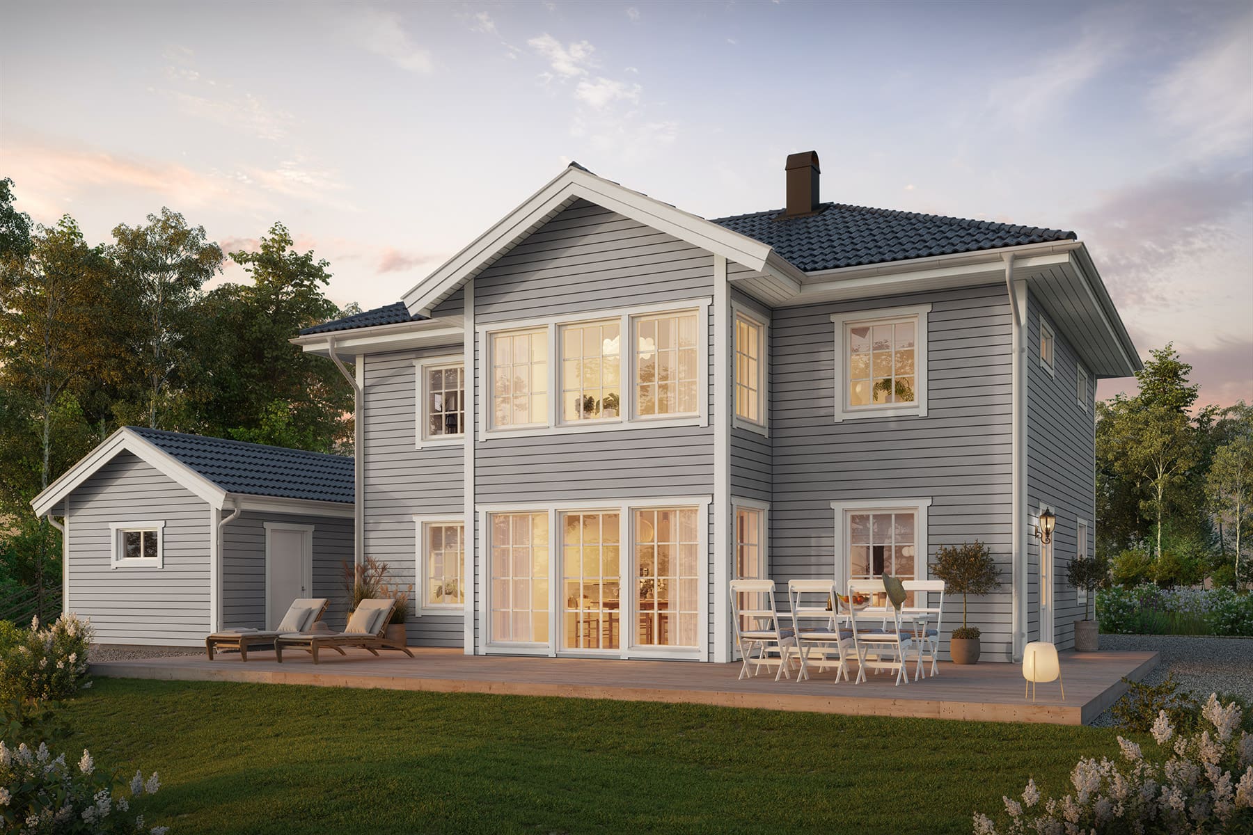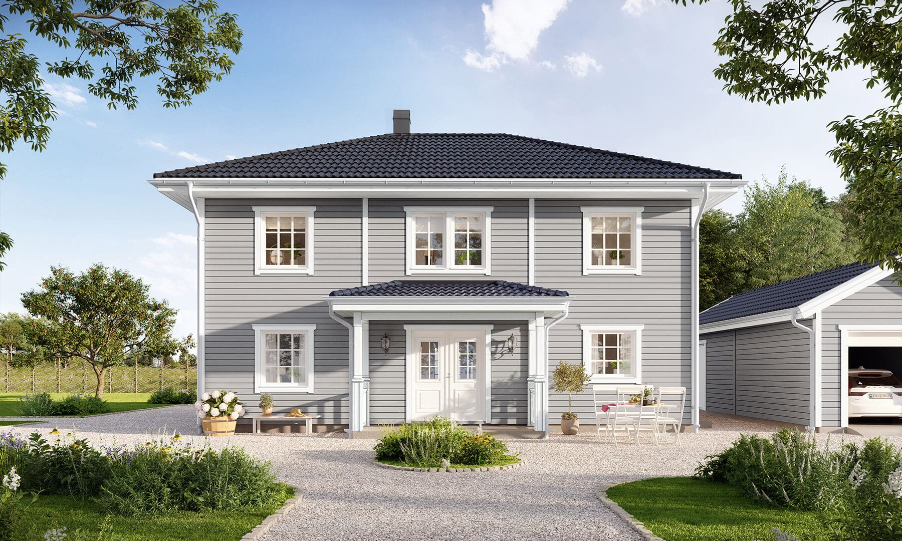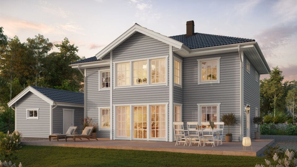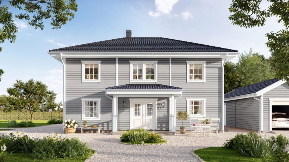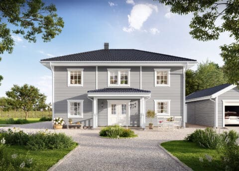 Den åpne verandaen gir Stjärnhem Klassisk en herlig innbydende følelse. Oppdag et hus med en god balanse mellom estetikk og funksjon. Stjärnhem Klassisk er et hus som er lett å endre og som er romslig i forhold til sine kvadratmeter, hvor sosiale områder deler plass med fire soverom og en herlig spisestue. Et praktisk og klassisk hus i to etasjer, som er som skapt for både land- og byliv.