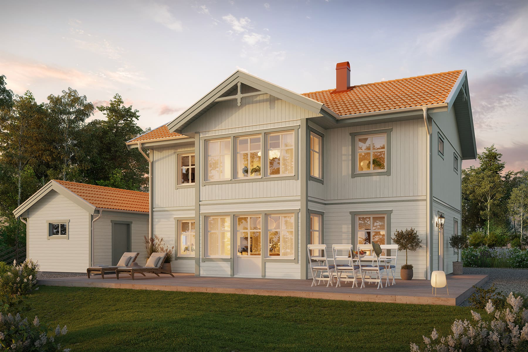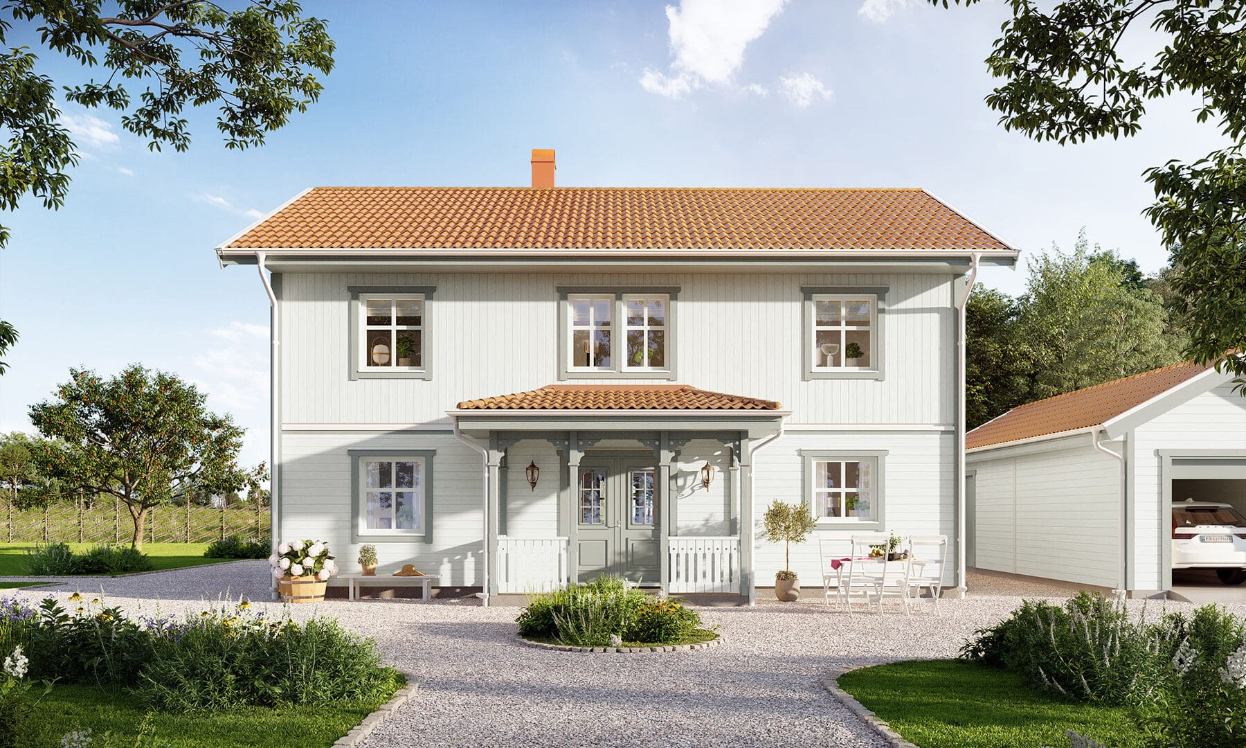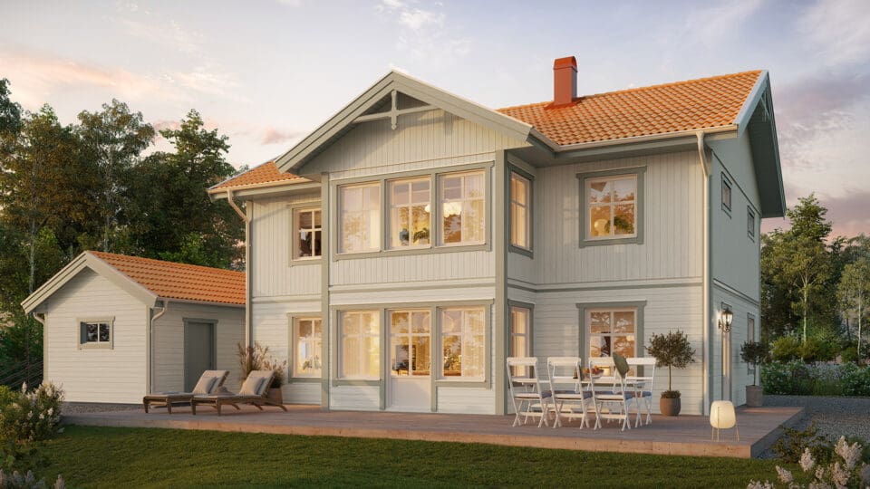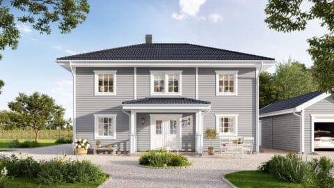 Med klassisk landskapspanel og en symmetrisk inngang med veranda får Stjärnhem en herlig landlig følelse. Her er det plass til det meste, med en god balanse mellom estetikk og funksjon. Stjärnhem er et hus som er lett å endre og romslig i forhold til sine kvadratmeter, hvor sosiale områder deler plass med fire soverom og en herlig spisestue. Et praktisk Bullerby-hus, som laget for livet på landet.